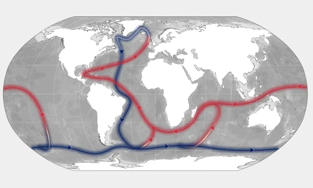 Diep in de Atlantische Oceaan bevindt zich een van de belangrijkste “motoren” van het klimaatsysteem: de Atlantic Meridional Overturning Circulation (AMOC). Dit complexe systeem van oceaanstromingen transporteert warm water vanuit de tropen naar het noorden en brengt koud water terug naar het zuiden. Daardoor speelt het een cruciale rol in het reguleren van het klimaat, vooral in Europa.